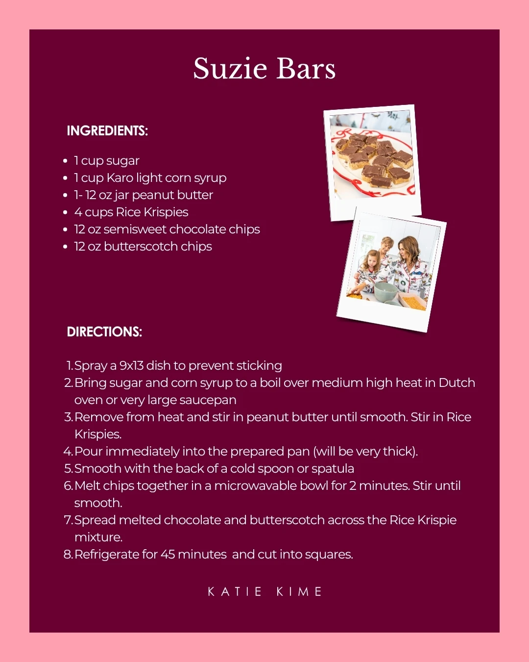 There are just those certain recipes that it wouldn’t be the holidays without, Suzie Bars being a prime example. Katie and her mom baked these for the crew while we were on set in Palm Springs. Just when you swore you couldn’t have another bite, you’d find yourself wandering back to the kitchen for just one more bar. From Katie’s kitchen to yours, here’s the full recipe: